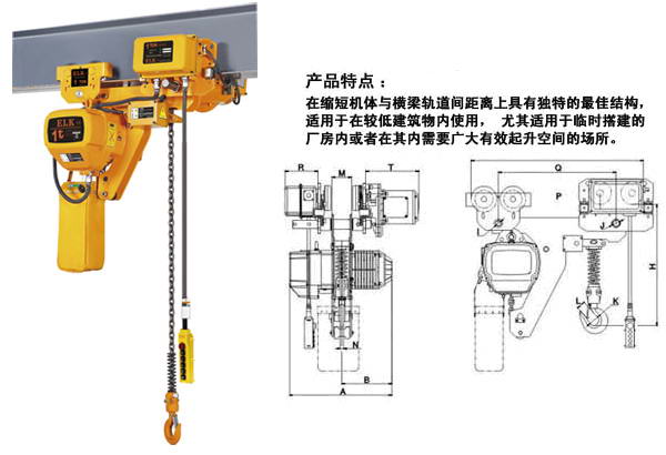 在縮短機(jī)體與橫梁軌道間距離上具有獨(dú)特的最佳結(jié)構(gòu),適用于在較低建筑物內(nèi)使用,尤其適用于臨時(shí)搭建的廠房內(nèi)或者在其內(nèi)需要擴(kuò)大有效起升空間的場所。