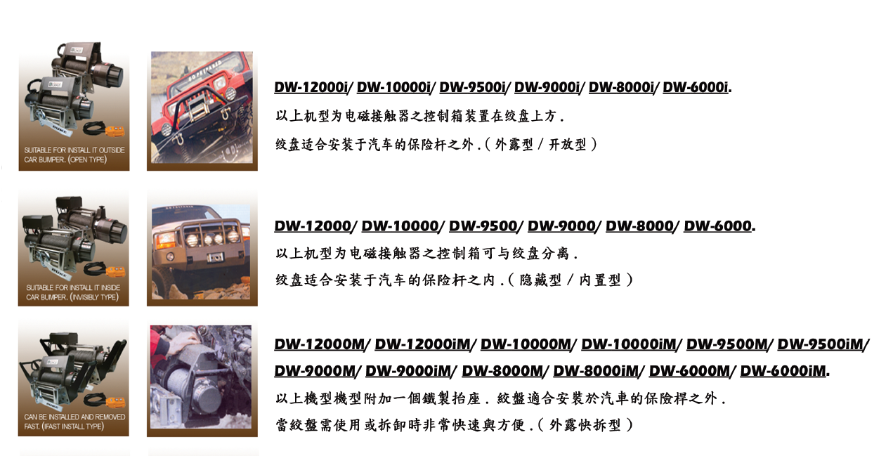 汽車絞盤主要用于越野汽車、農(nóng)用汽車、ATV運(yùn)動(dòng)車、艇游、以及其它特別車輛,是車輛、船只自我保護(hù)及牽引的裝置。可在雪地、沼澤、沙漠、海灘、泥濘山路等惡劣環(huán)境中進(jìn)行車輛自救,并可能在其它條件下,進(jìn)行清障、拖拉物品、安裝設(shè)施等作業(yè),是軍警、石油、水文、環(huán)保、林業(yè)、交通、公安、邊防、消防及其它野外運(yùn)動(dòng)不可缺少的安全裝置。
